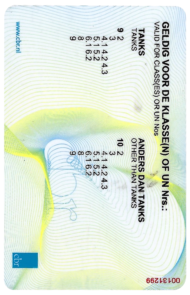 Ik heb de nodige kaarten om sommige speciale plaatsen binnen te komen, bijvoorbeeld: CARGO CARD, ALFAPAS, ACN PAS, die nodig zijn voor de havens van Nederland en België, evenals het ADR certificaat dat nodig is voor het vervoer van gevaarlijke goederen, VCA Basis certificaat en ik heb alle documenten inclusief mijn eigen NIWO certificaat waarmee ik al deze transportwerkzaamheden mag uitvoeren.